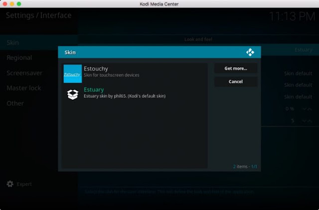 Загрузка на Get more ... доступен список скинов, которые могут быть легко установлены на вашем Kodi. В этом примере мы рассмотрим установку скина Confluence .